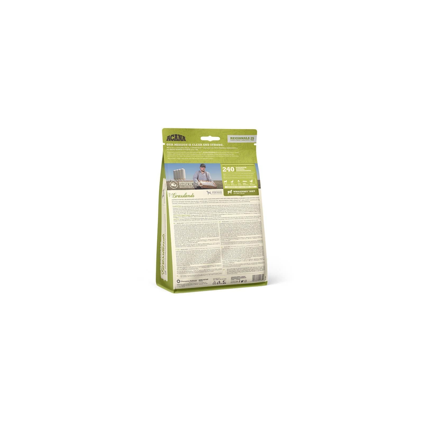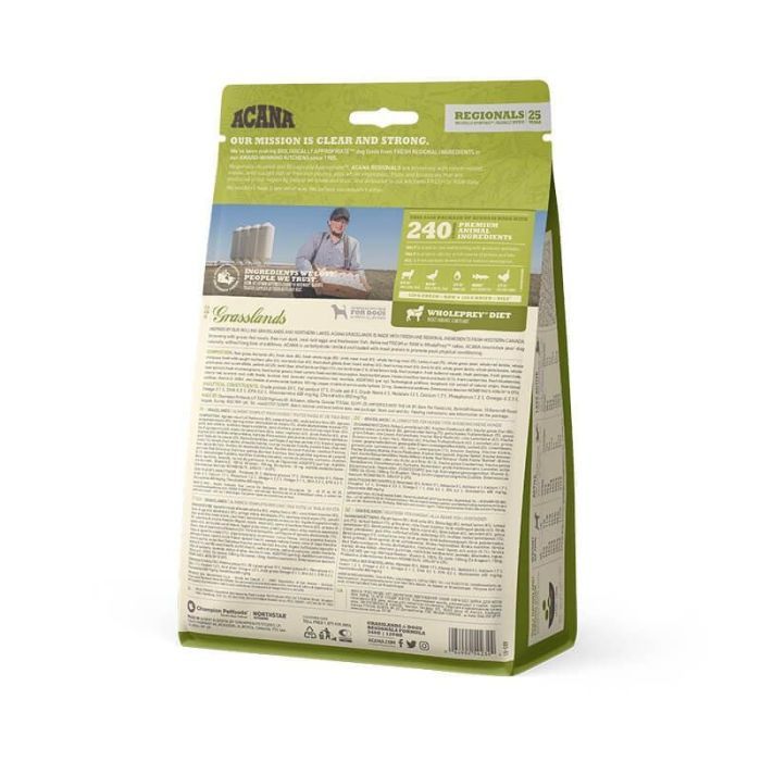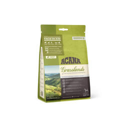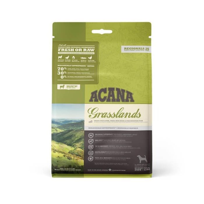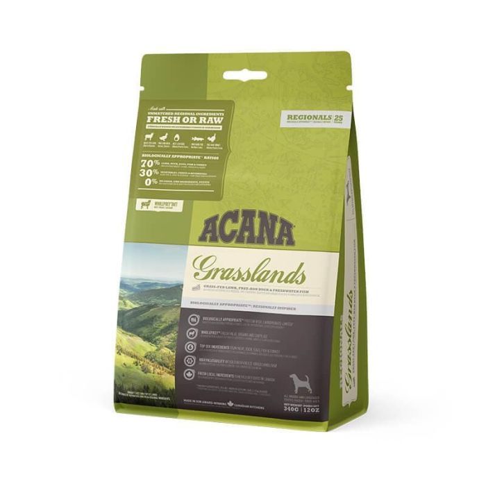 Сухий корм для собак усіх порід ACANA Grasslands Dog виготовлений із неперевершених інгредієнтів. Містить м’ясо тварин, вирощених і виловлених у Західній Канаді, включно зі свіжим м'ясом ягнят, качкою й індичкою, вирощених на «вільному вигулі», цільними гніздовими яйцями й цільною північною щукою, виловленою в природі. Всі ці інгредієнти доставляються щодня свіжими або сирими в співвідношенні WholePrey для відтворення природного раціону собак. ACANA живить вашу собаку, природно, без додавання довгого списку синтетичних добавок.
