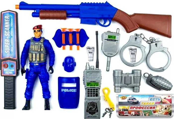 - Состав набора винтовка, бинокль (муляж), наручники (муляж), рация (2 шт., муляжи), сканер досмотра (муляж), граната (муляж), щит, шлем, связка ключей, фигурка полицейского, 3 мягких дротика, 2 зажима дляраций.