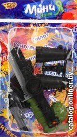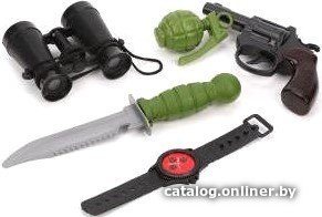 - Состав набора пистолет, бинокль, часы (имитация), граната и кинжал.