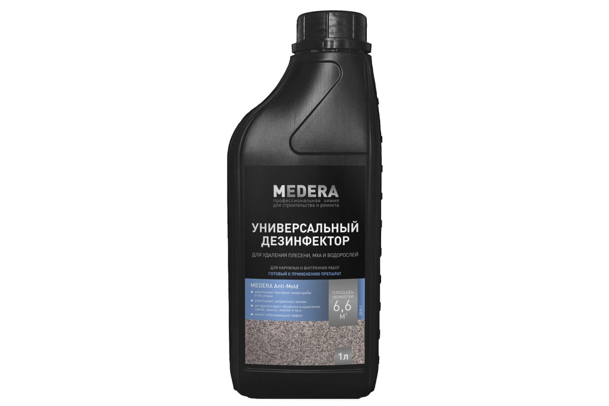 Чистящее средство MEDERA Anti-Mold, Медера Анти-Молд 1 л 2010-1 рекомендовано для очистки поверхностей от плесени, мха и водорослей. Состав подходит для обработки внутренних стен сооружений и конструкций, поверхностей в полуподвальных и подвальных помещениях, ванных, банях, саунах. Продукт можно использовать как моющее средство с отбеливающим эффектом.