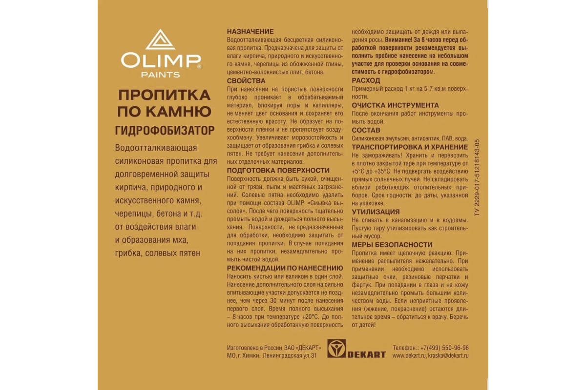 Пропитка по камню OLIMP 5 л 9901 - бесцветная водоотталкивающая пропитка (гидрофобизатор) для защиты кирпича, натурального камня, черепицы из обожжённой глины, цементно-волокнистых плит, бетона. Пропитка предназначена для защиты от атмосферного воздействия и влажности. Блокирует поры и капилляры от проникновения влаги.