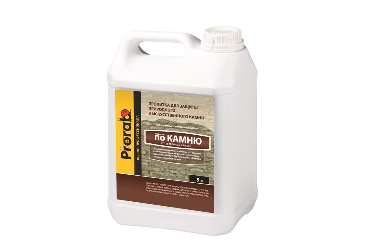 Пропитка по камню PRORAB Естественный камень 5 л PPEK-05 предназначена для надежной защиты бетона, кирпича, шифера, природного и искусственного камня от влаги. Средство используют для обработки фасадов перед покраской, каменных столешниц, ванных комнат, подоконников. Продукт придает поверхности эффект "естественного камня" и бактерицидные свойства. Состав с высокой проникающей способностью не токсичен, экологически безопасен и не имеет сильного запаха.