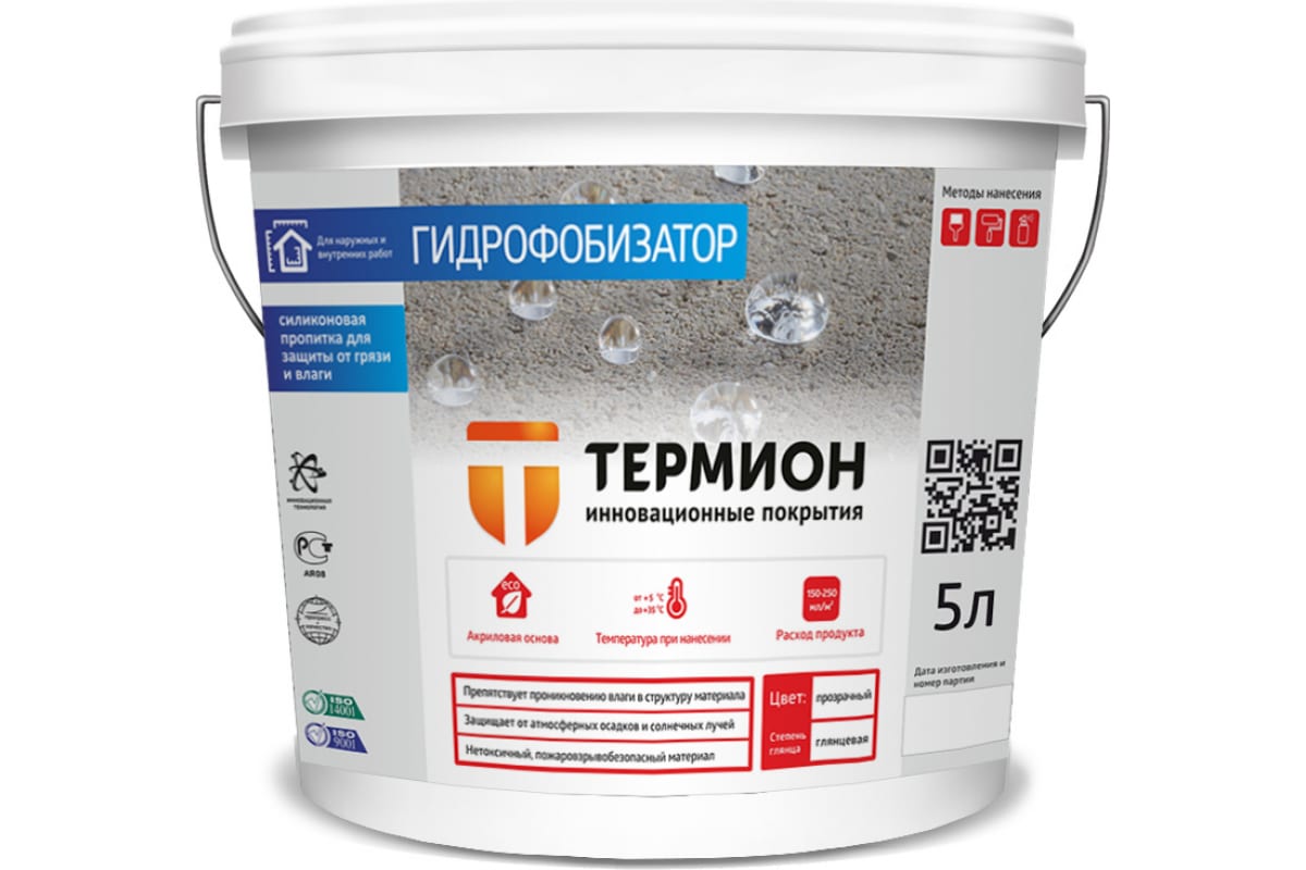 Гидрофобизатор ТЕРМИОН 5 л ГФ10001 -это водные (или органические) растворы силиконовых компонентов. Гидрофобизатор, благодаря воде, или другому «транспортировщику», попадает внутрь материала, на который наносится покрытие. Там он создаёт водозащитный, при этом проницаемый слой, защищающий конструкцию от попадания влаги.