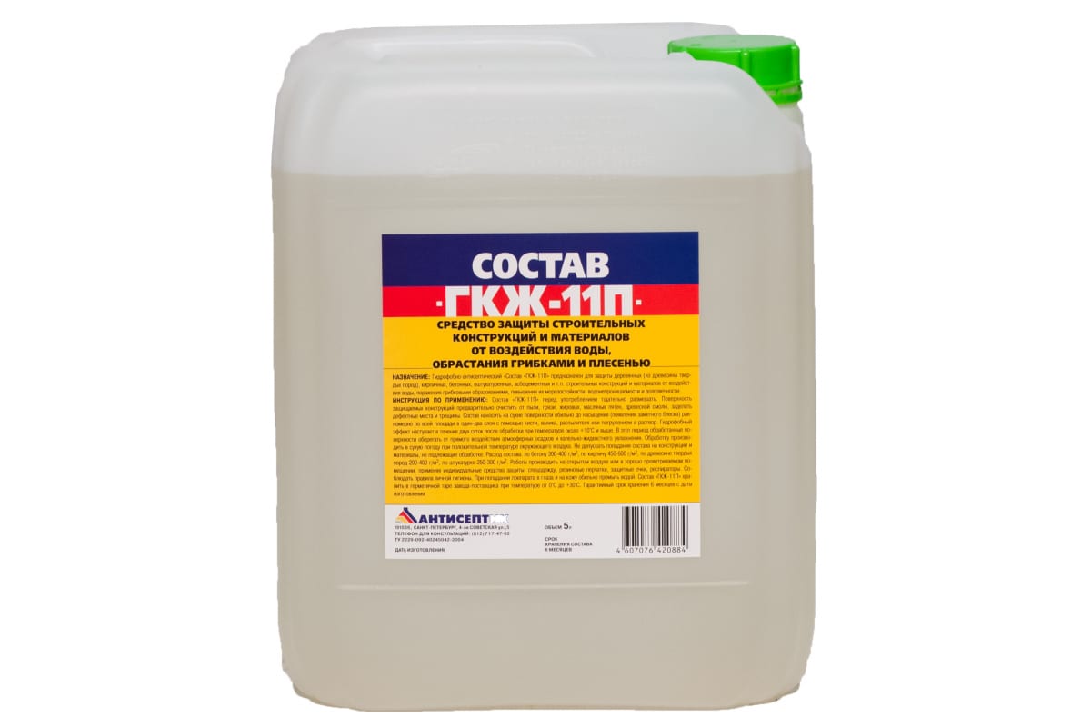 Гидрофобизатор ЗАО "Антисептик" ГКЖ-11П состав в канистре 10 литров 00-00003478 обеспечивает защиту деревянных (из древесины твердых пород), кирпичных, бетонных, оштукатуренных, асбоцементных и т.п. строительных конструкций и материалов от воздействия воды, поражения грибковыми образованиями, повышение их морозостойкости, водостойкости и долговечности.