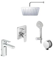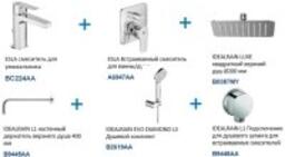 • В комплекте держатель, смеситель, душевая лейка, душевой шланг, верхний душ, душевой кронштейн, смеситель для умывальника