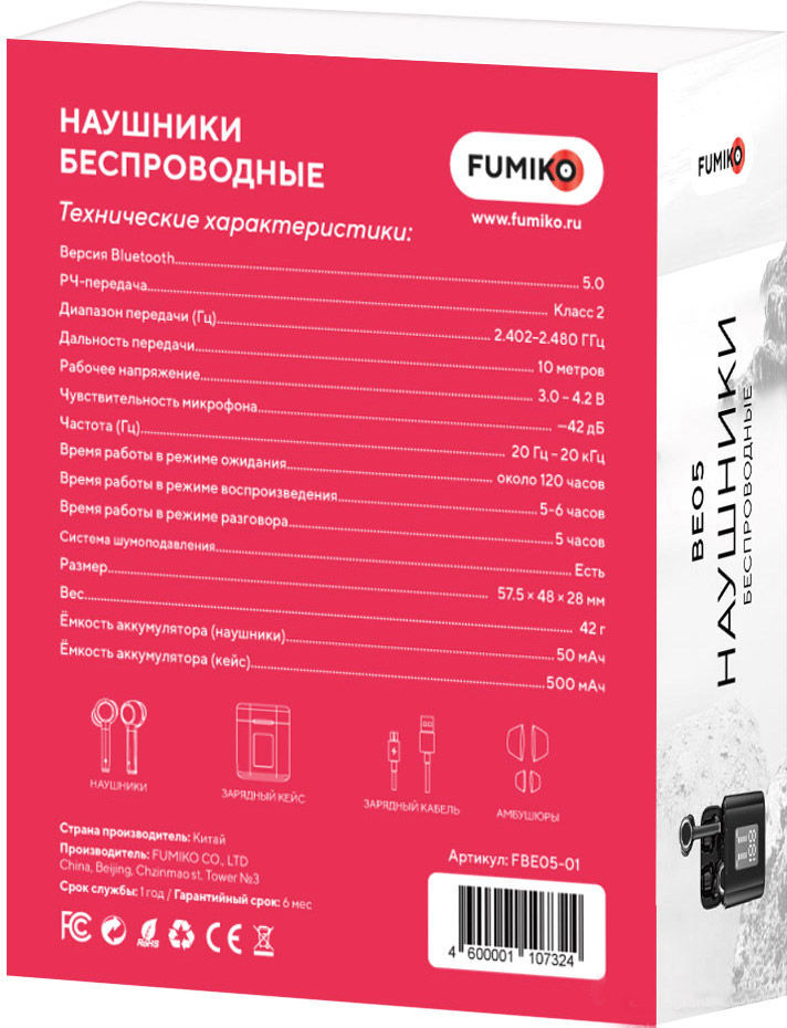 Наушники с микрофоном, беспроводные, внутриканальные, портативные, максимальное время работы 6 ч.
