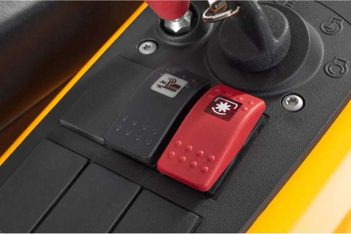 Комфорт и удобство трактора обеспечиваются за счет эргономичного сиденья с высокой спинкой и удобного подстаканника. Гидростатическая трансмиссия позволяет плавно регулировать скорость с помощью педали, что дает возможность удобно водить с плавным ускорением и торможением без необходимости переключать передачи вручную.