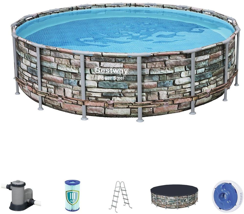 Семейный, каркасный, круглый, 19480 л, сливной клапан, комплектация: тент-чехол, лестница, фильтр-насос, картриджный фильтр.