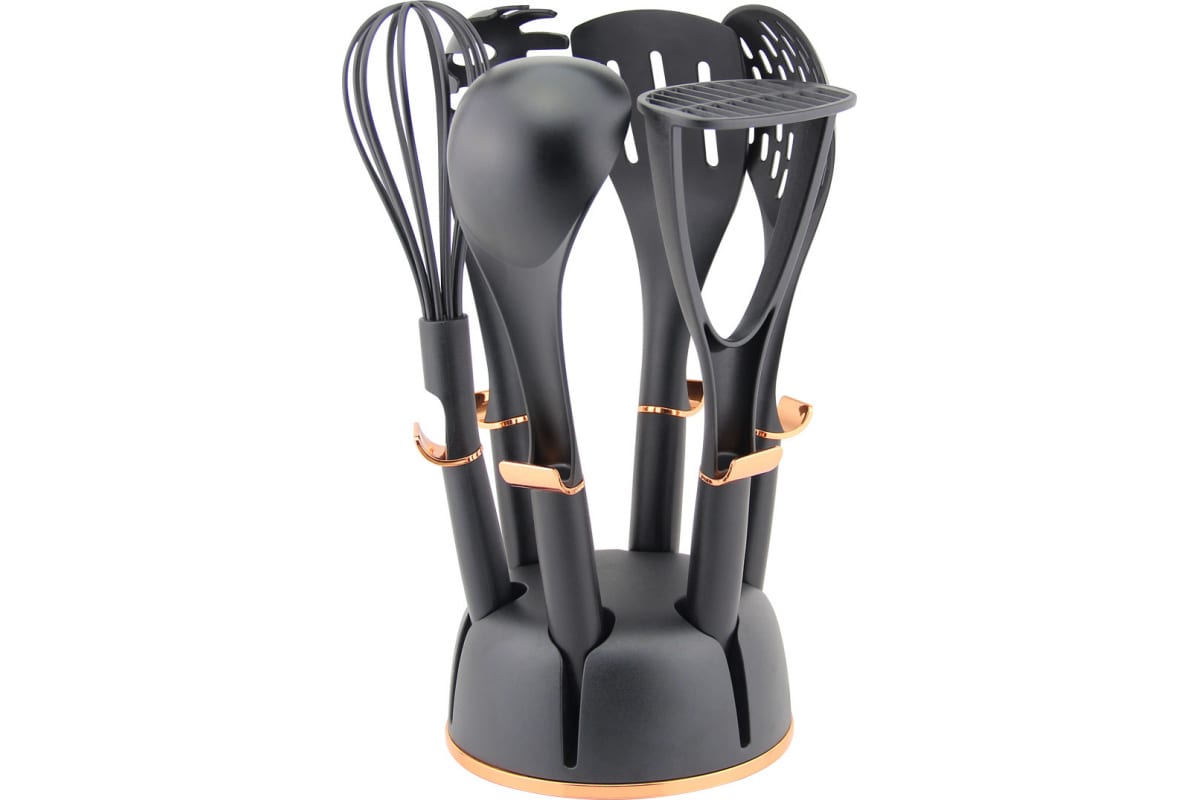 Набор кухонных принадлежностей Pomi d'Oro, 7 предметов P180101 Аssistenza содержит 7 предметов. В набор входит половник, лопатка для жарки, толкушка для картофеля, ложка для спагетти, шумовка, венчик и удобная подставка для компактного хранения на кухне. Все изделия выполнены из качественного пищевого пластика. Для устранения заводского запаха перед первым применением рекомендуется промыть набор в теплой воде с небольшим количеством моющего средства. Станет подарком для домохозяйки, мамы, любимой подруги, на день рождения и 8 марта.