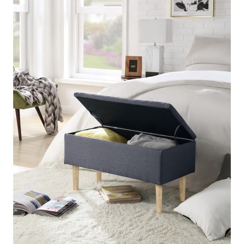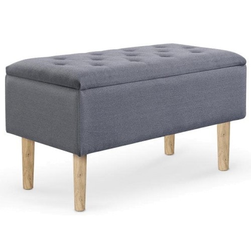 Представленная скамейка - это предмет мебели, вдохновленный скандинавским стилем. Он обит серой тканью с декоративной простежкой. Он опирается на четыре ножки из массива каучукового дерева черного цвета.
