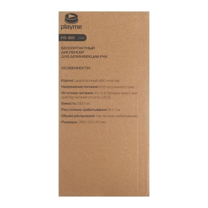Диспенсер бесконтактный Playme HS-801, для антисептика, распыление, 1 л, 4хR14/220В