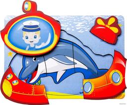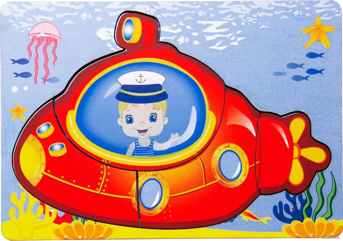 - Комплектация Деревянная многослойная панель с контурами – 1 шт.;Фигурки разных размеров — 4 шт.: Подводная лодка, дельфин, краб, рыба — клоун. Поделены на 4, 3, 2 части, последнее, самая маленькая фигурка – целая.
