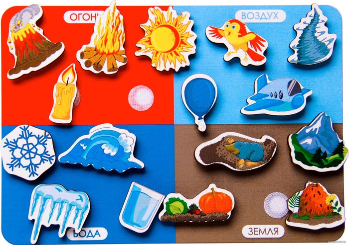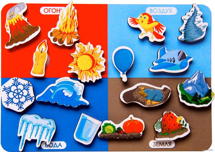 - Комплектация Деревянная панель, поделенная на четыре сектора (красный – огонь; голубой – воздух; синий – вода; коричневый – земля) и липами – 1 шт.Фигуры на липах 16 шт.Сектор огонь: свеча, солнце, костер, вулкан – 4 шт.;Сектор воздух: птица, вихрь, самолет, шарик – 4 шт.;Сектор вода: волна, стакан воды, снежинка, сосулька – 4 шт.;Сектор земля: гора, грядка, муравейник, крот в норе – 4 шт.