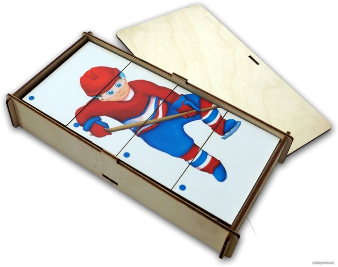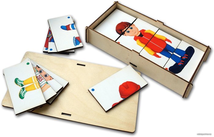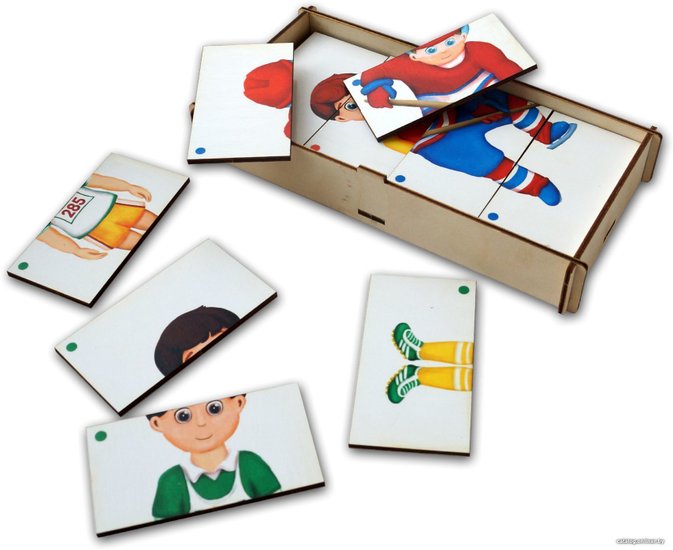 - Комплектация Деревянный ящик для хранения картинок – 1 шт.Составные картинки 6 шт. с изображением людей разных профессий.Каждая картинка поделена на четыре части.
