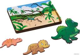 - Комплектация Деревянная многослойная панель с контурами – 1 шт.Фигурки динозавров разных размеров — 4 шт.: Поделены на 4, 3, 2 части, последний, самый маленький динозавр — целый.