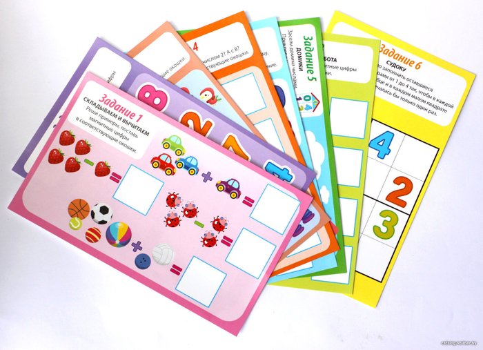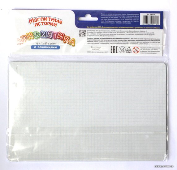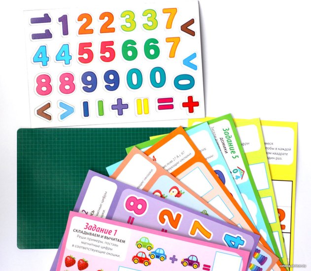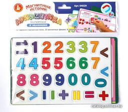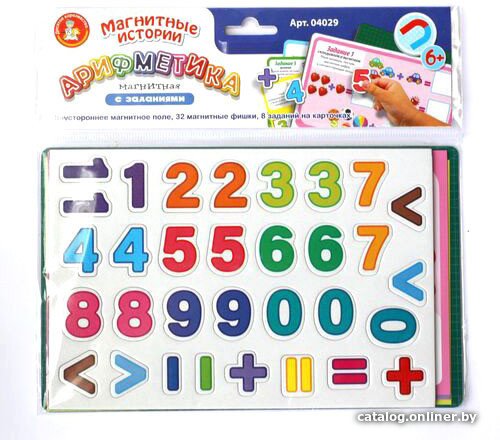 Комплектациядвухстороннее магнитное игровое поле (23,5 х 14,7 см)карточки с заданиями – 8 шт. (22,5 х 13,7 см)магнитные цифры и знаки – 32 шт. (высота – 3 см)