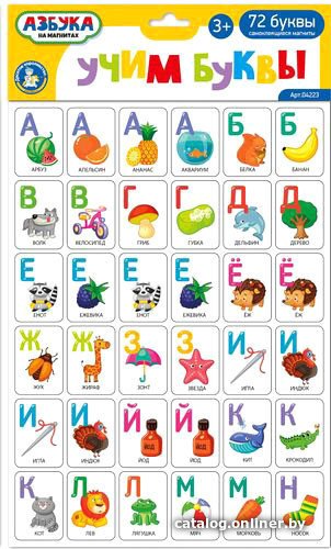 - Комплектация карточки с буквами – 72 шт. (3,5 х 5 см)самоклеющиеся магниты – 72 шт.