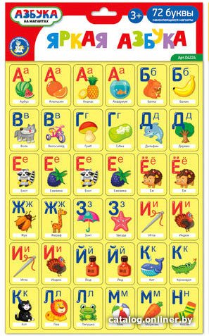 - Комплектация карточки с буквами – 72 шт. (3,5 х 5 см)самоклеющиеся магниты – 72 шт.