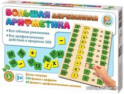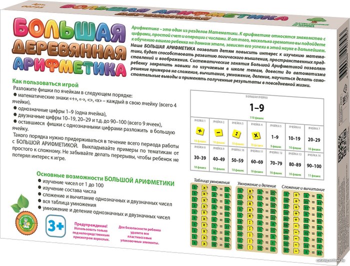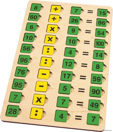 - Комплектация деревянное игровое поле – 1 шт. (30 х 20 см)деревянные фишки с цифрами и числами (зеленого цвета) – 210 шт. (22 х 22 х 3 мм)деревянные фишки с арифметическими знаками (желтого цвета) – 40 шт. (22 х 22 х 3 мм)