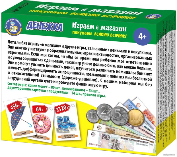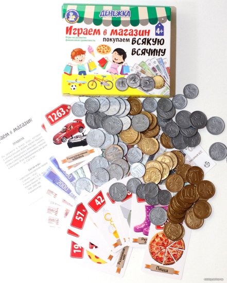 - Комплектация монеты – 80 шт. (диаметр от 21 до 25 мм)копии банкнот – 54 шт.двусторонние карточки с объектами – 14 шт. (55 х 85 мм)правила игры