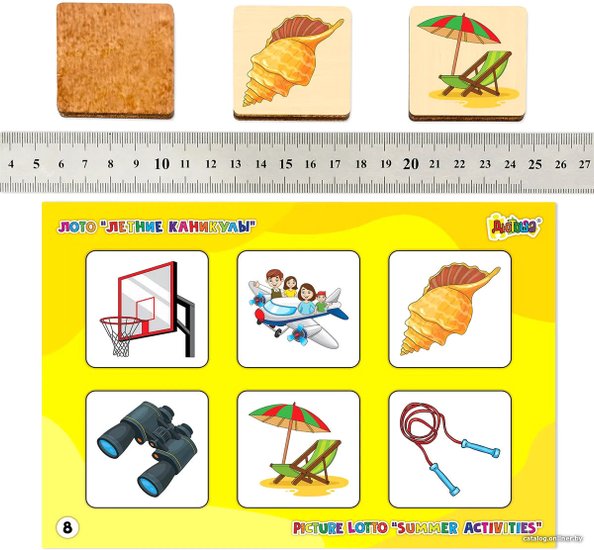- Комплектация 48 деревянных фишек, 8 карточек, мешочек