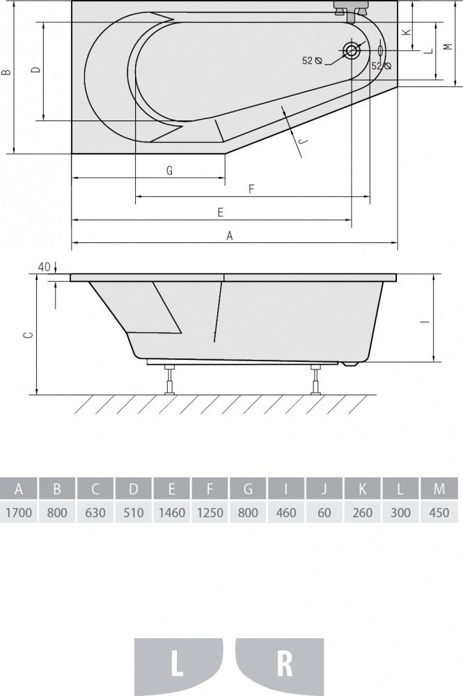 Наружная форма многогранная; материал акрил; длина 170 см; ширина 80 см; высота 46 см; объем 225 л.