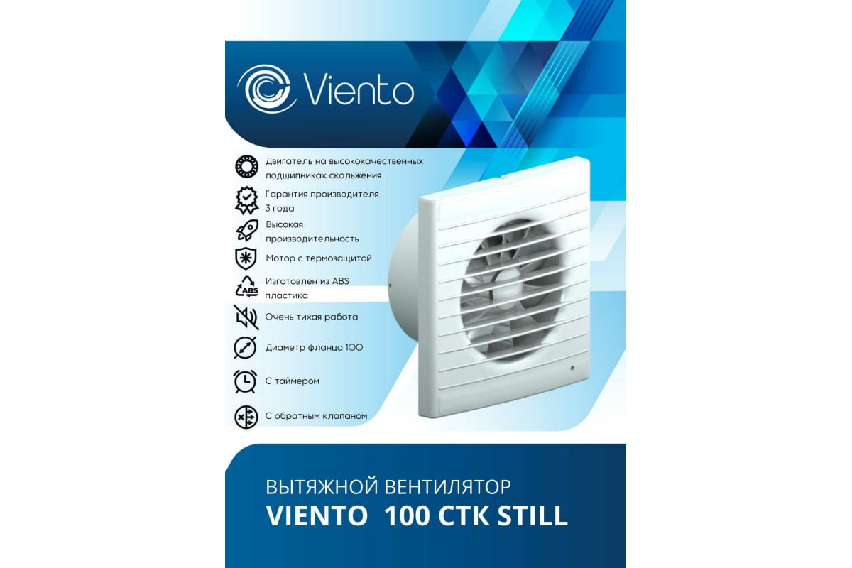 Осевой вытяжной вентилятор ВИЕНТО с обратным клапаном и таймером малошумный 100СТK STILL применяется для постоянной или периодической вытяжной вентиляции бытовых помещений.