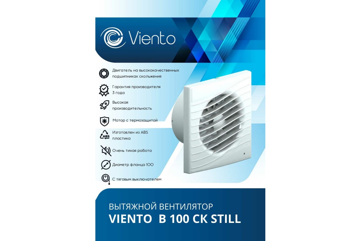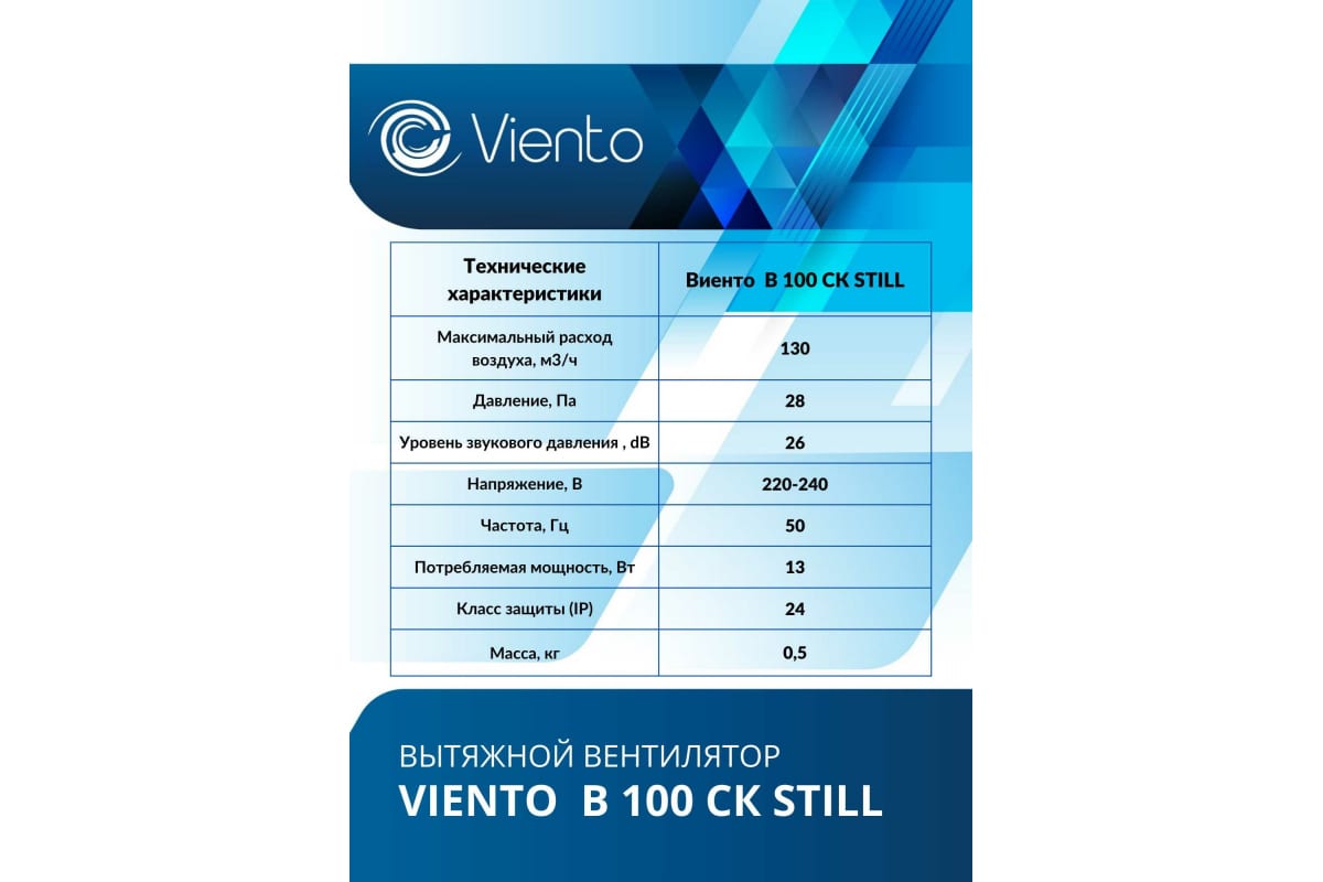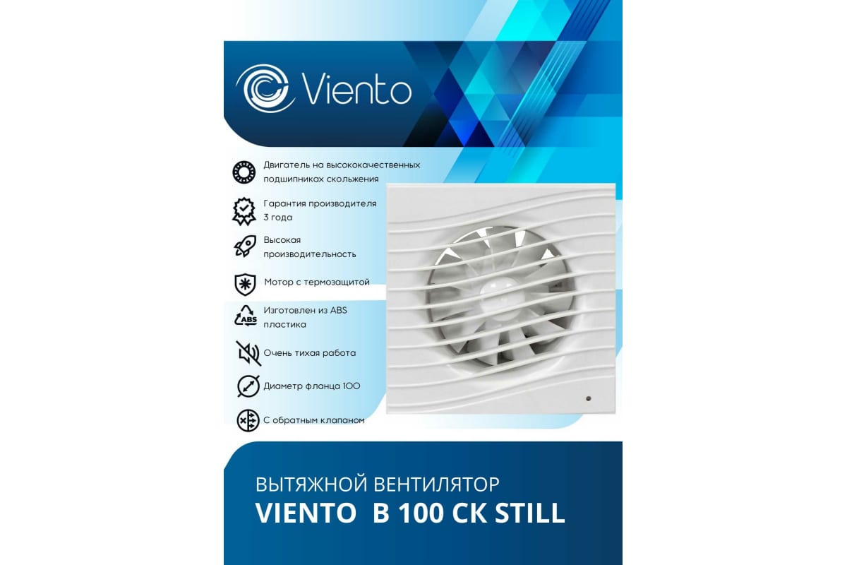 Осевой вытяжной вентилятор ВИЕНТО с обратным клапаном малошумный В100СК STILL применяется для постоянной или периодической вытяжной вентиляции бытовых помещений.