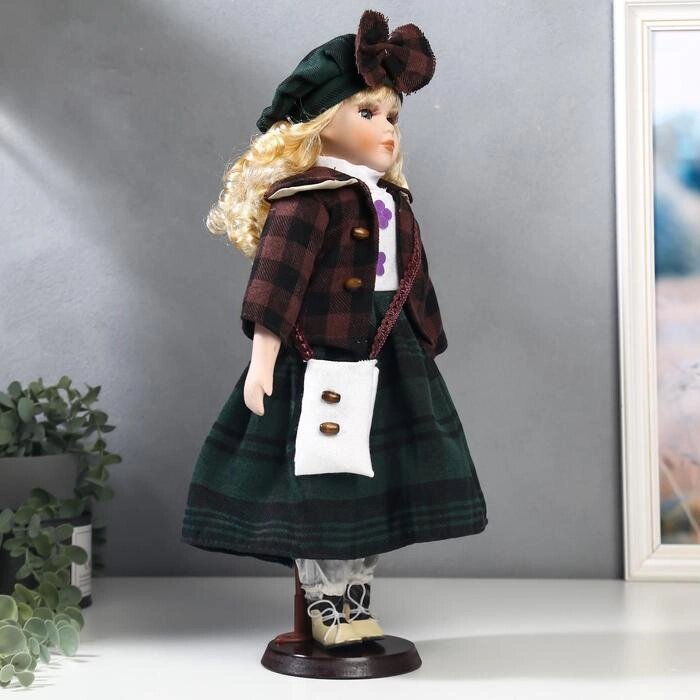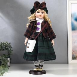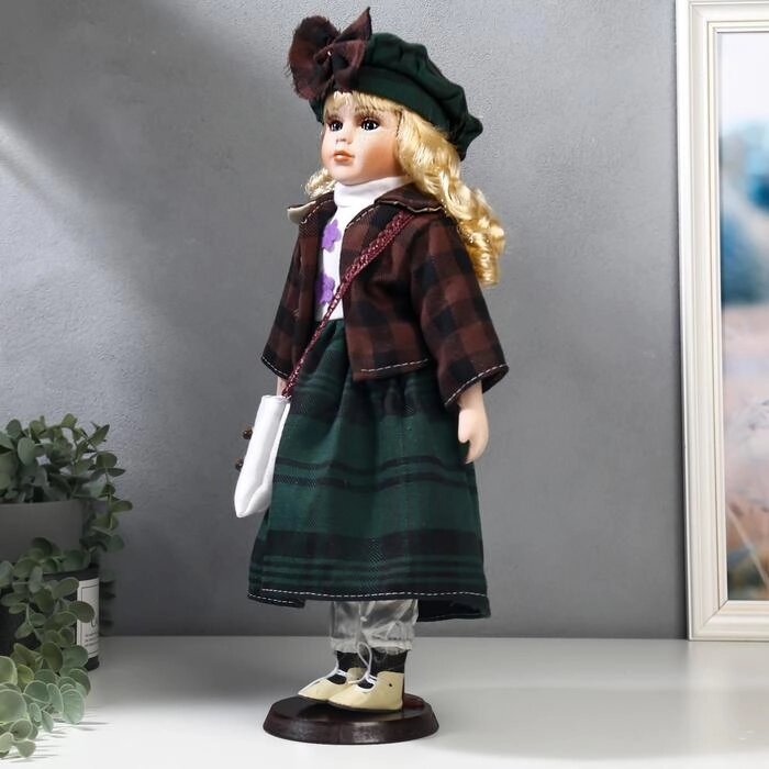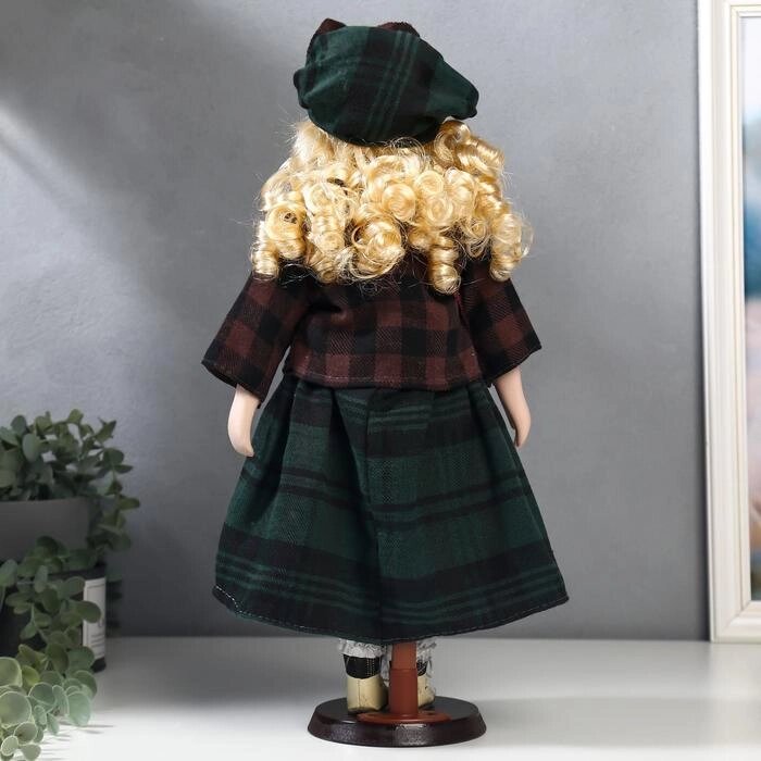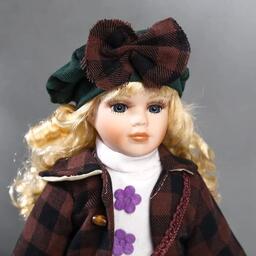 Кукла коллекционная керамика "Блондинка с кудрями, юбка в синюю клетку и берет" 40 см