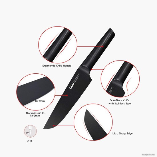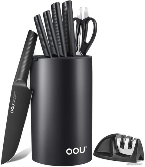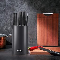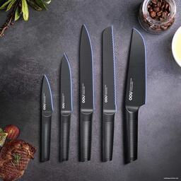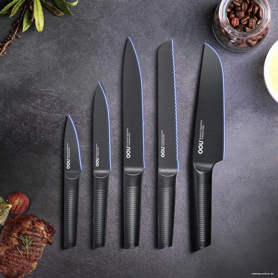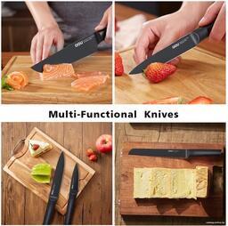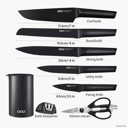 Комплектация8-дюймовый Шеф-нож. Шеф-нож- главный клинок на каждой кухне и создан для большинства работ по разделке и нарезке продуктов. С его помощью удастся филигранно разделать тушку утки, цыпленка или кролика, нарезать мясо и рыбу на стейки, измельчить овощи, фрукты и корнеплоды для повседневных или праздничных блюд. Клинок имеет большой размер и внушительное лезвие – то, что нужно для работы с крупными продуктами разной плотности.8-дюймовый Нож для нарезки. Функционал – аналог шефа, но с упором на шинковку. Может применяться как основной рабочий нож на кухне- разделывать мясо и рыбу, нарезать овощи, фрукты, гастрономию, превращать продукты в кусочки любого размера для последующего приготовления бутербродов, салатов, супов и многих других блюд.8-дюймовый нож для хлеба5-дюймовый овощной нож.Для чистки овощей и фруктов, резки колбасы и сыра, измельчения чеснока или, чтобы покрошить грибы и зелень для салата.3,5-дюймовый Нож для разделки. Компактный размер обеспечивает преимущество этого клинка в работах с небольшими продуктами, когда требуется максимальный контроль и точность резаТочило для ножейУниверсальный блок для ножейКухонные ножницы