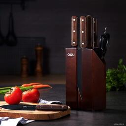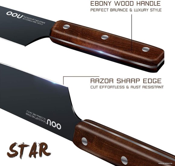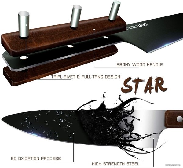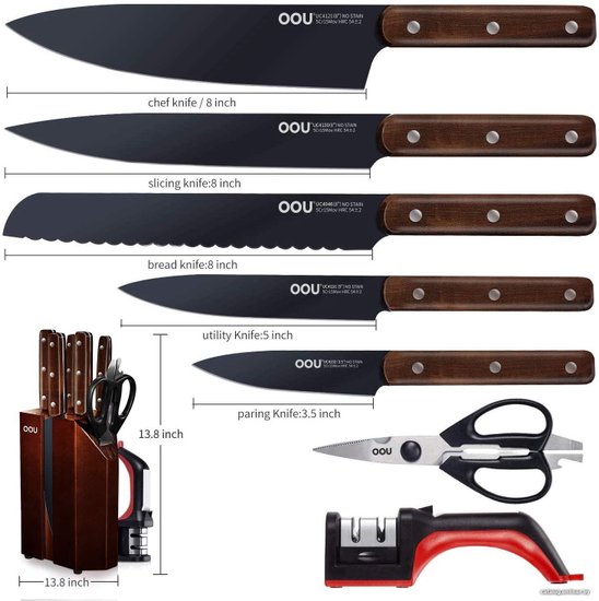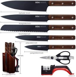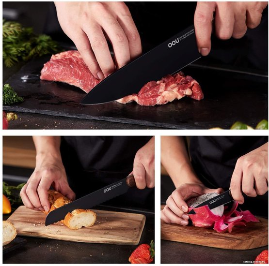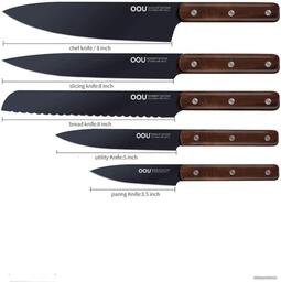 Комплектация8-дюймовый Шеф-нож. Шеф-нож- главный клинок на каждой кухне и создан для большинства работ по разделке и нарезке продуктов. С его помощью удастся филигранно разделать тушку утки, цыпленка или кролика, нарезать мясо и рыбу на стейки, измельчить овощи, фрукты и корнеплоды для повседневных или праздничных блюд. Клинок имеет большой размер и внушительное лезвие – то, что нужно для работы с крупными продуктами разной плотности.8-дюймовый Нож для нарезки. Функционал – аналог шефа, но с упором на шинковку. Может применяться как основной рабочий нож на кухне- разделывать мясо и рыбу, нарезать овощи, фрукты, гастрономию, превращать продукты в кусочки любого размера для последующего приготовления бутербродов, салатов, супов и многих других блюд.8-дюймовый нож для хлеба5-дюймовый овощной нож.Для чистки овощей и фруктов, резки колбасы и сыра, измельчения чеснока или, чтобы покрошить грибы и зелень для салата.3,5-дюймовый Нож для разделки. Компактный размер обеспечивает преимущество этого клинка в работах с небольшими продуктами, когда требуется максимальный контроль и точность резаТочило для ножейБлок для ножейКухонные ножницы