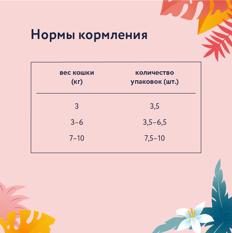 Рекомендации по кормлению: Переход с предыдущего рациона осуществлять постепенно, небольшими порциями в течение 5-7 дней. При кормлении необходимо учитывать активность и аппетит животного. Корм должен быть комнатной температуры. Содержимое открытой упаковки хранить при температуре +5°С и использовать в течение 2 дней.