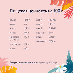 Витамины и минеральные вещества, (100 г) не менее: витамин А - 100 МЕ, витамин D - 10 МЕ, витамин E - 0,5 МЕ, железо - 6 мг, медь - 0,2 мг, марганец - 0,25 мг.