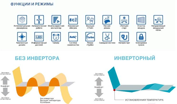 - Режим работы охлаждение, обогрев, вентиляция, автоматический, сон (тишина)