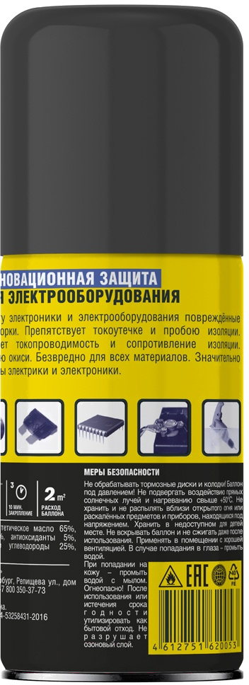 • Основа синтетическое масло (65%), антикоррозийные добавки (5%), антиоксиданты (5%), парафиновые и нафтеновые углеводороды (25%), углеводородный пропеллент