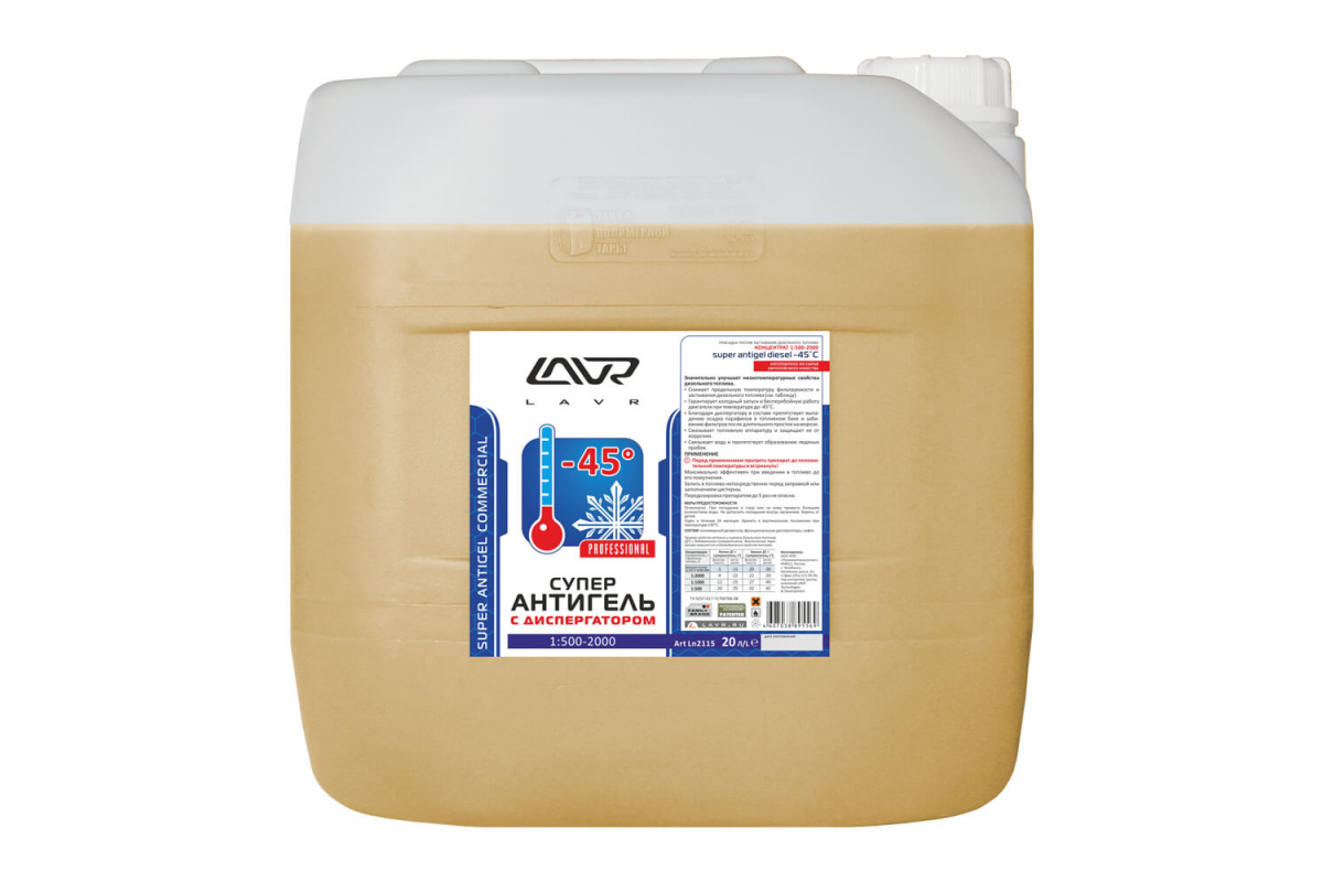 Суперантигель с диспергатором в дизельное топливо Lavr на 40000л, 20 л Ln2115 предотвращает выпадение парафинового осадка в баке для топлива, исключает забивание фильтра, обеспечивает холодный запуск двигателя при температуре -45ºС.