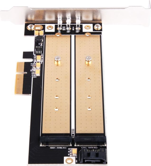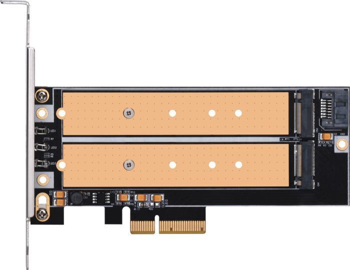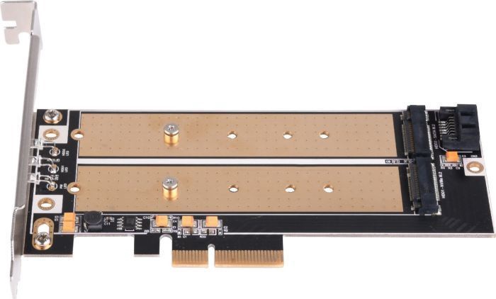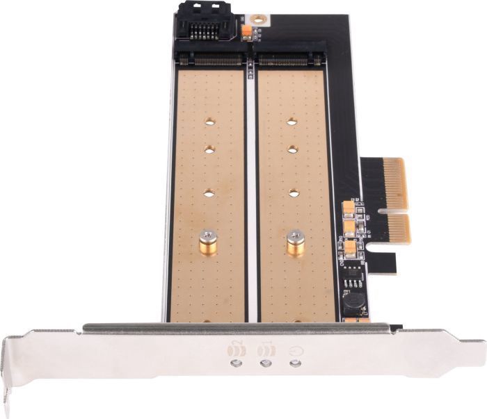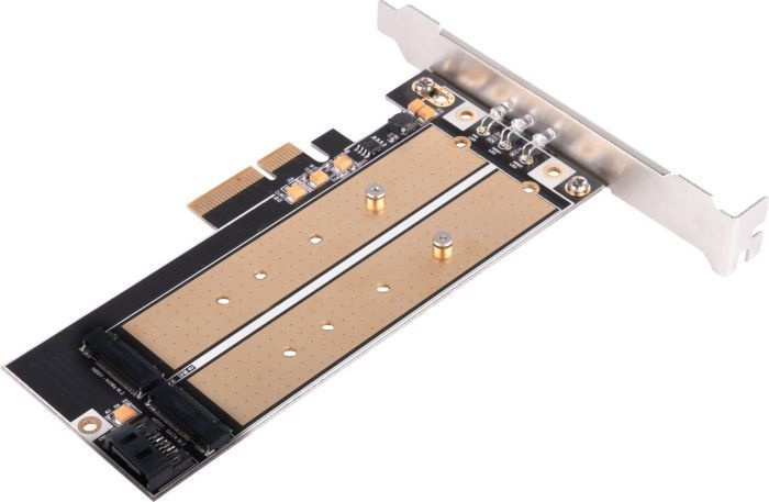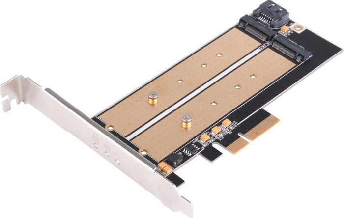 Papildoma informacijaPalaiko M.2 SSD iki 110 mm. Konvertuoja vieną M.2 prievadą (raktą M) į vieną PCIe x4 sąsają. Konvertuoja antrąjį prievadą M.2 (B raktas) į SATA sąsają. Palaiko du M.2 SSD vienu metu
