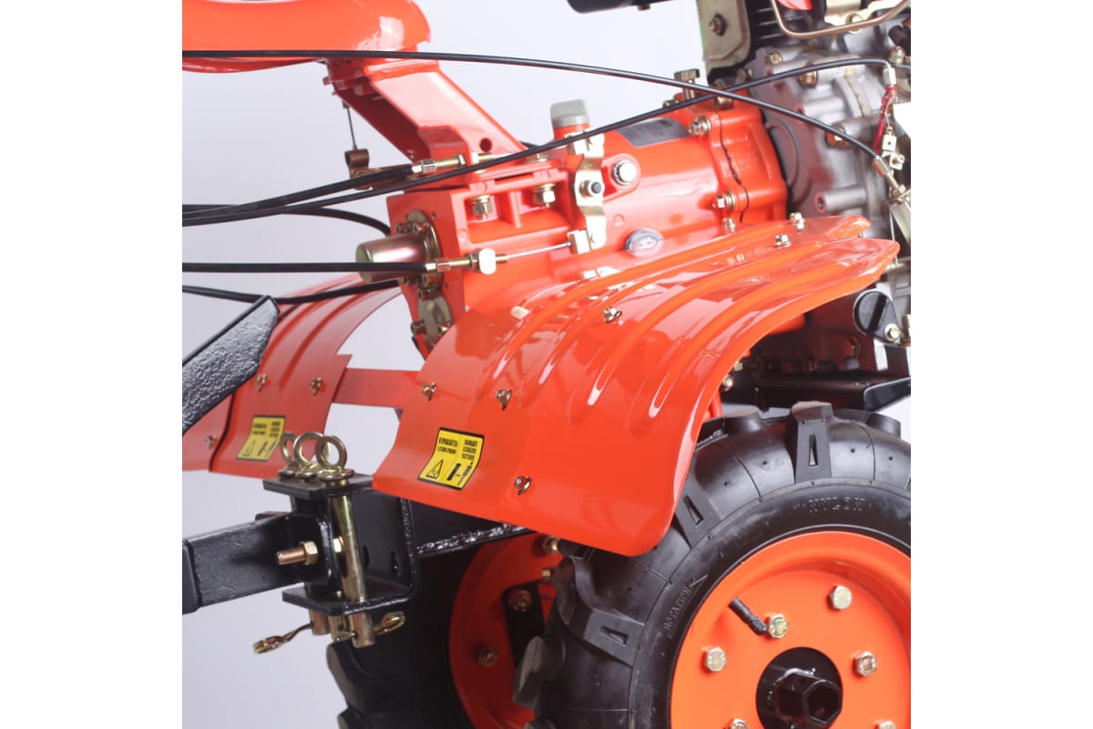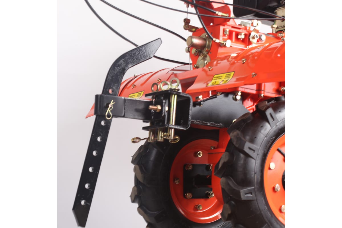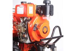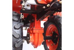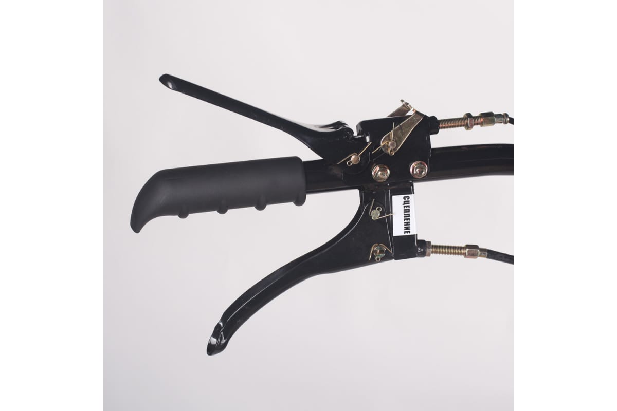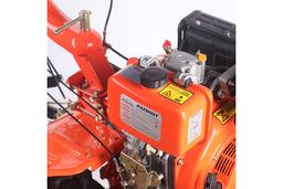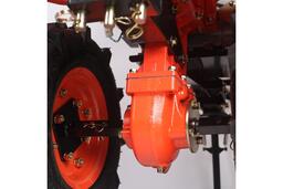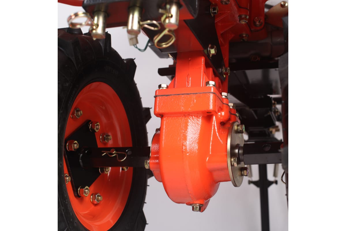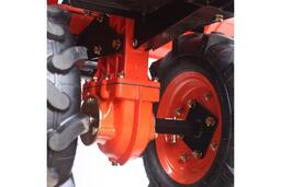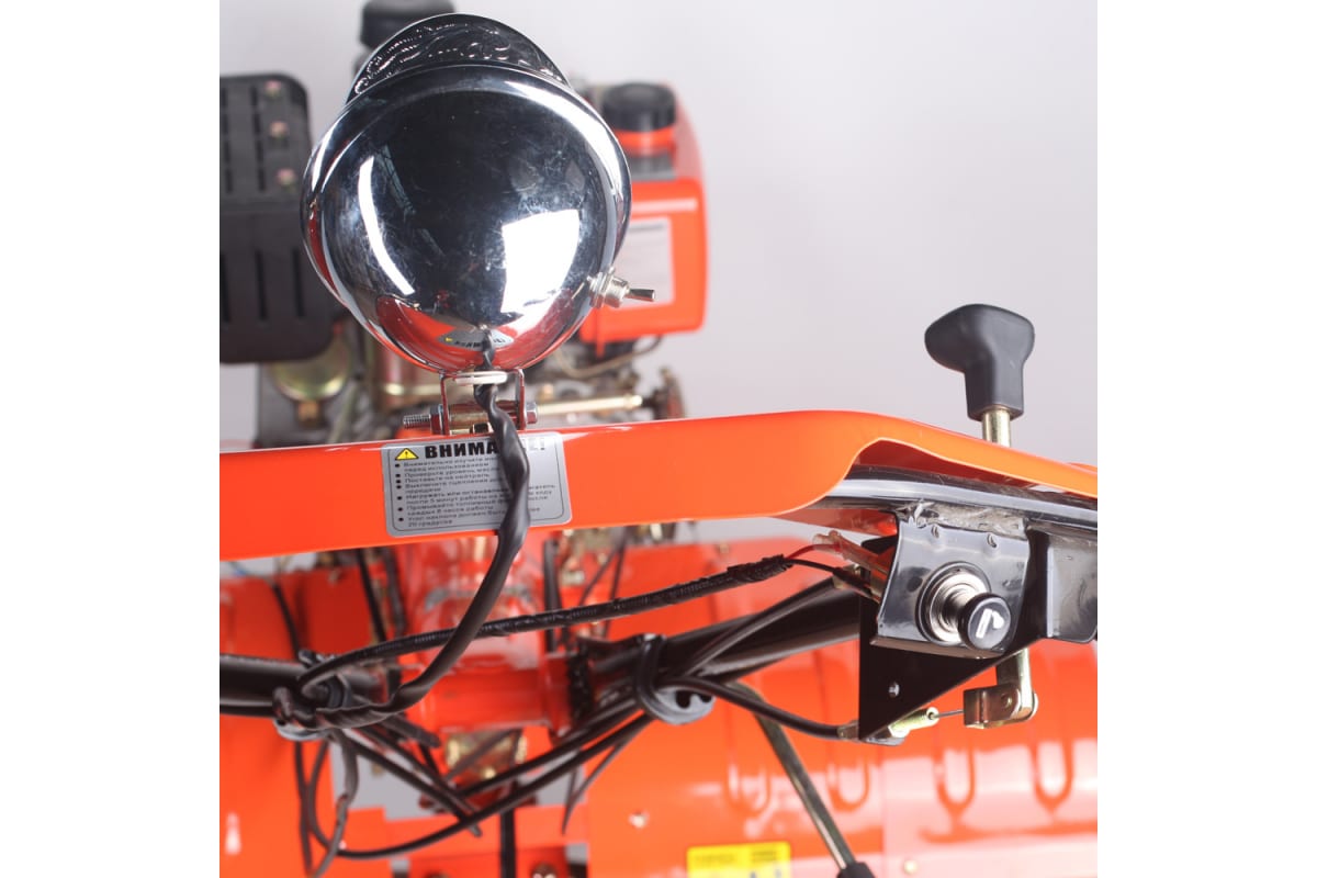 Преимуществом является используемый тип передачи - шестеренчатый редуктор в масляной ванне, а значит мотоблок легко справится с тяжелой интенсивной работой. Благодаря возможности регулировки, рукоятку можно настроить под индивидуальные особенности оператора. Большие колеса и шины с агрессивным рисунком протектора улучшают сцепление с поверхностью и гарантируют отличную проходимость по любому грунту. Мотоблок оснащен фарой - работу можно продолжить после наступления темноты.