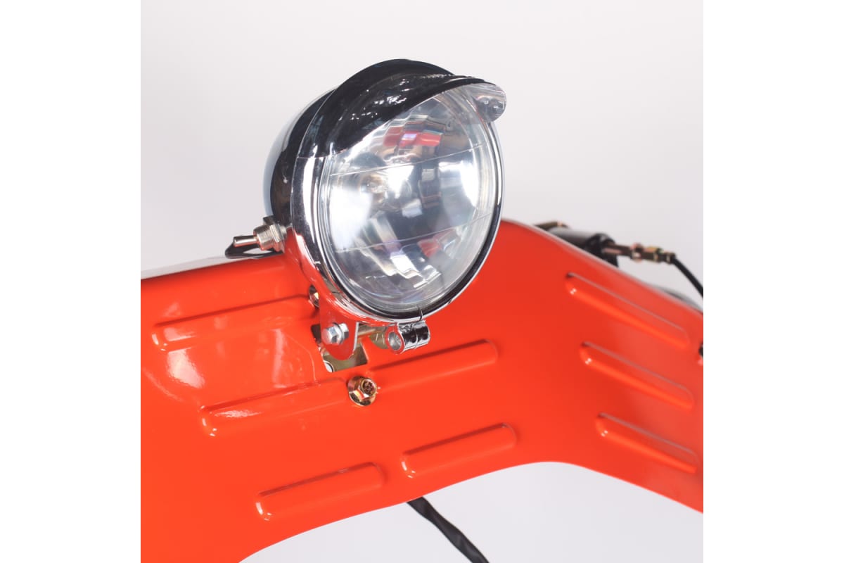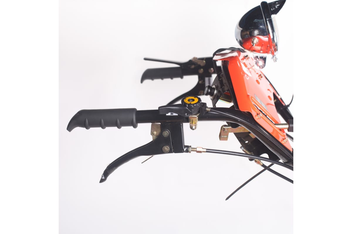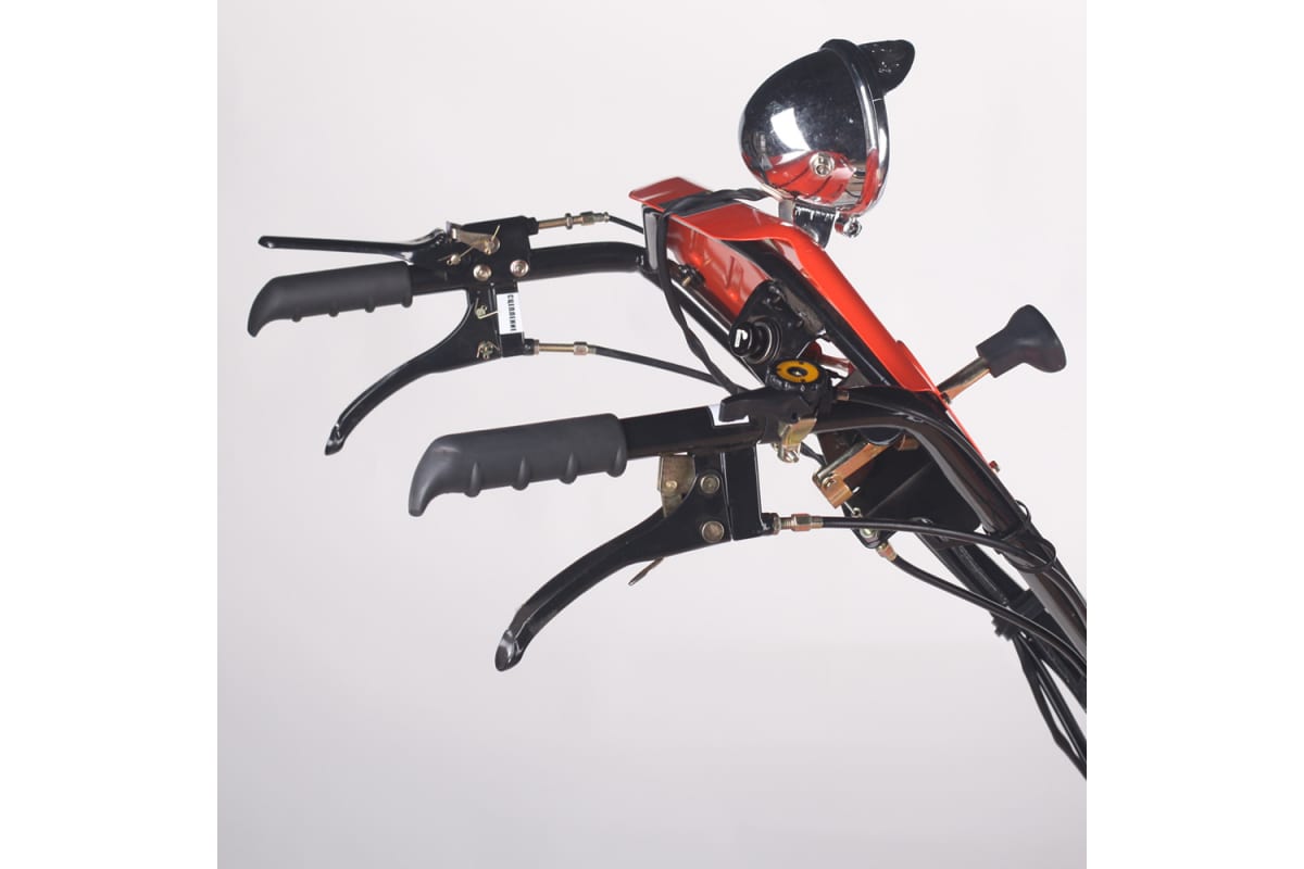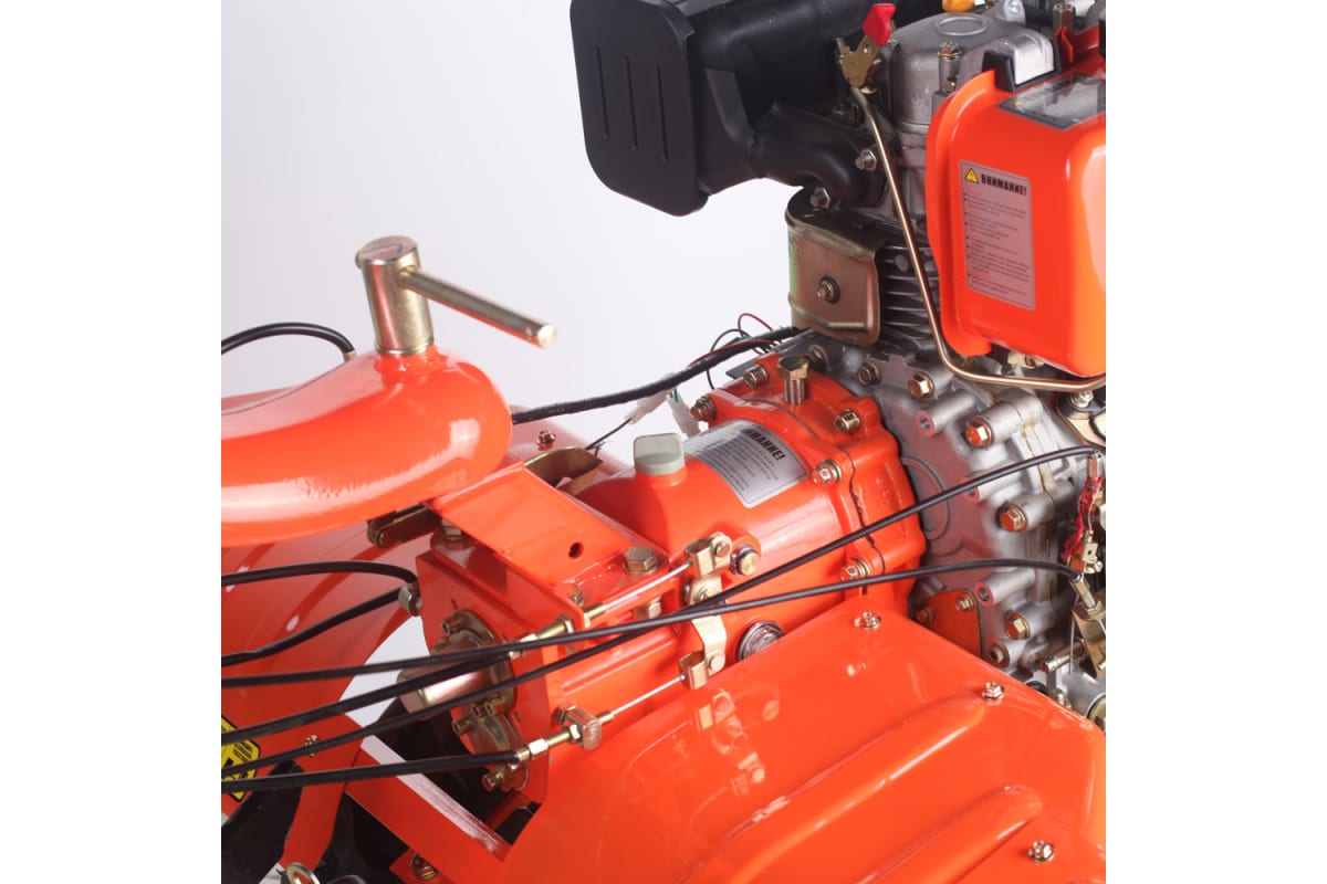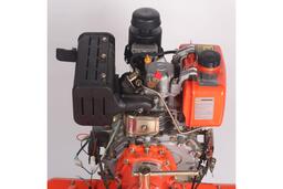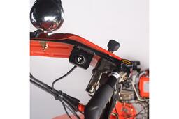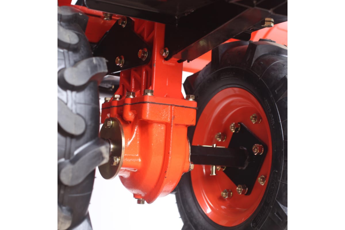 Преимуществом является используемый тип передачи - шестеренчатый редуктор в масляной ванне, а значит мотоблок легко справится с тяжелой интенсивной работой. Благодаря возможности регулировки, рукоятку можно настроить под индивидуальные особенности оператора. Большие колеса и шины с агрессивным рисунком протектора улучшают сцепление с поверхностью и гарантируют отличную проходимость по любому грунту. Мотоблок оснащен фарой - работу можно продолжить после наступления темноты.