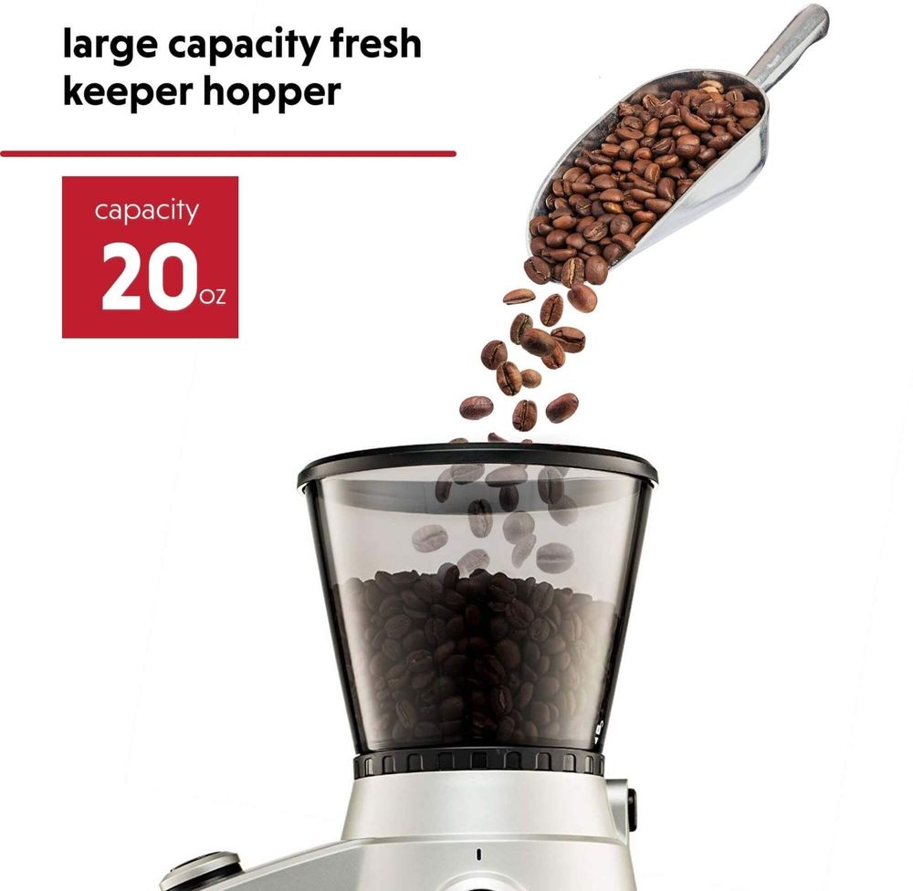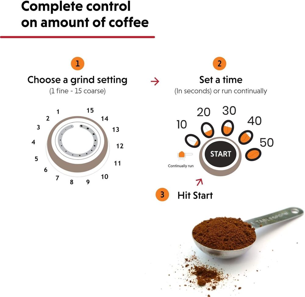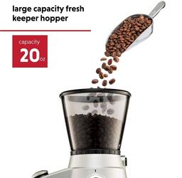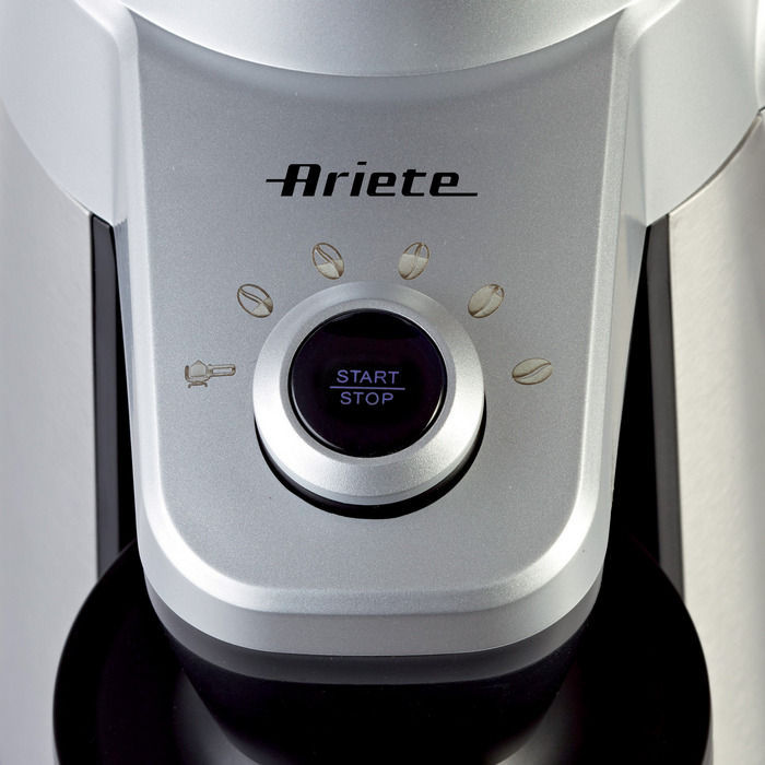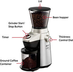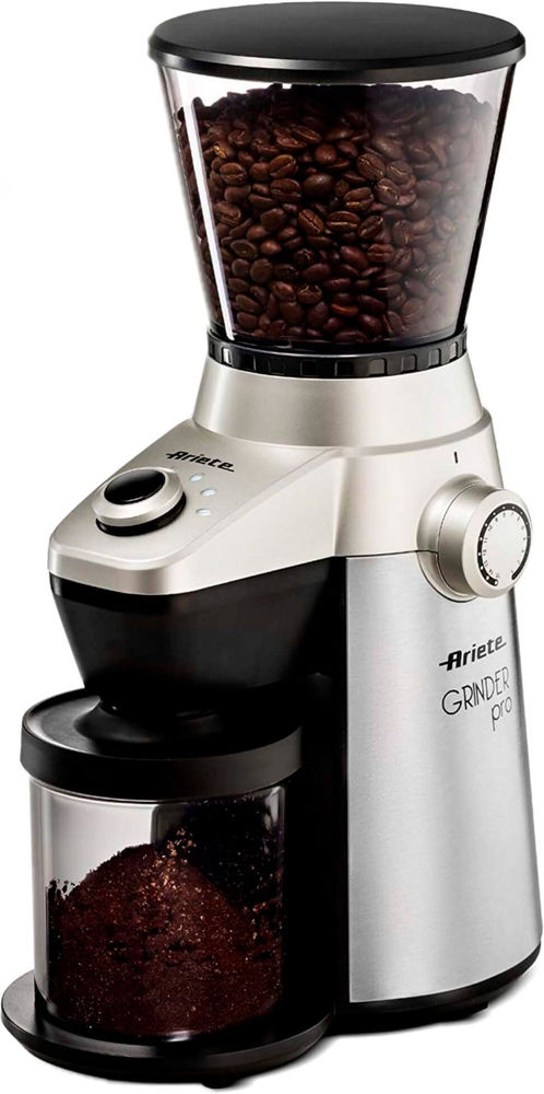 Жерновая кофемолка, мощность 150 Вт, вместимость 300 г, регулятор степени помола, дозировка молотого кофе, контейнер для молотого кофе.