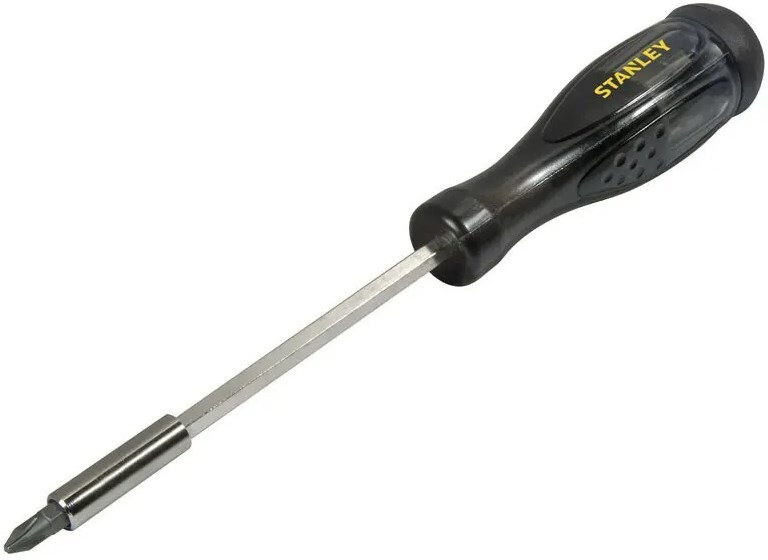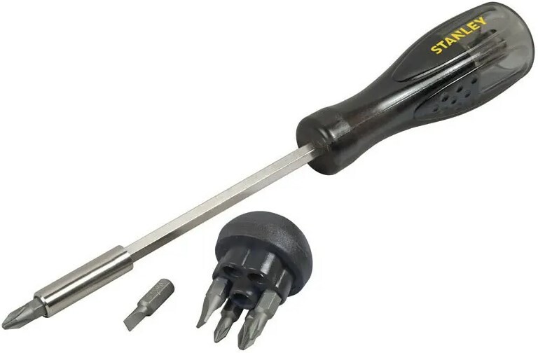 Stanley STHT0-62638 - ручной инструмент профессионального класса, выполненный из сочетания металла и пластика, отличающийся съемной конструкцией. Инструмент содержит большую рукоять, которая оснащается шестью сменными наконечниками со шлицами Philips, Pozidriv, Slotted.