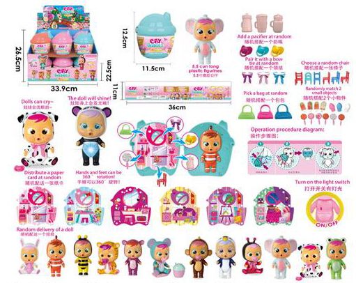 Crybabies Плачущий младенец, одетый в забавный комбинезончик. Помимо самой куклы, в комплекте: домик, соска, бутылочка, стульчик и аксессуары. Кукла имеет встроенный световой модуль. Кукла умеет плакать, перед началом игры необходимо заполнить водой специ