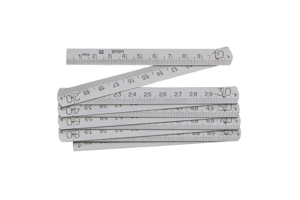 Складной метр Россия 30564 используется при плотницких, столярных и строительных работах. Состоит из металлических пластин с метрической шкалой. В сложенном состоянии инструмент удобно переносить, а при хранении он не занимает много места. Цена деления - 1 мм.