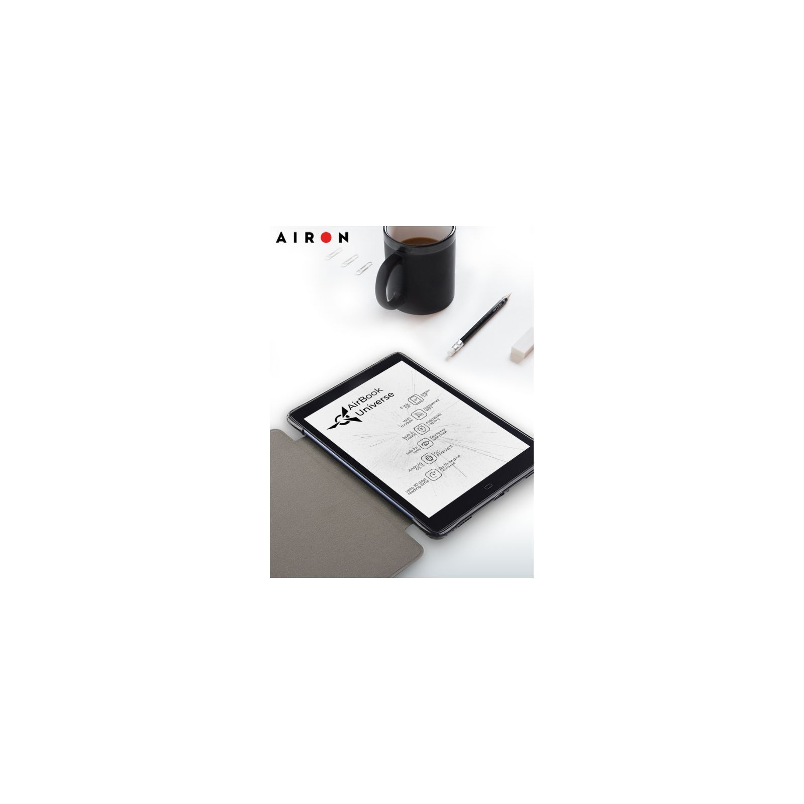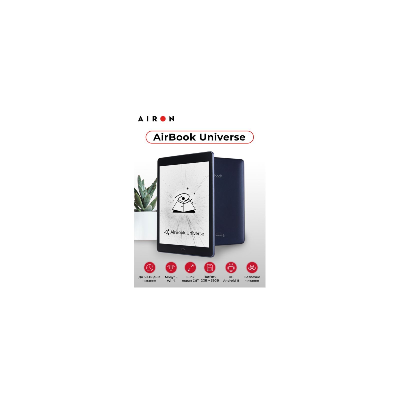 Рідер має компактний корпус товщиною всього 8 мм і при цьому оснащений модулями Wi-Fi і Bluetooth. Завдяки операційній системі Android 11, на якій базується AIRBOOK Universe, є можливість встановлювати на пристрій різні сторонні додатки, а 32 ГБ незалежної пам'яті дозволяють зберігати значну бібліотеку.