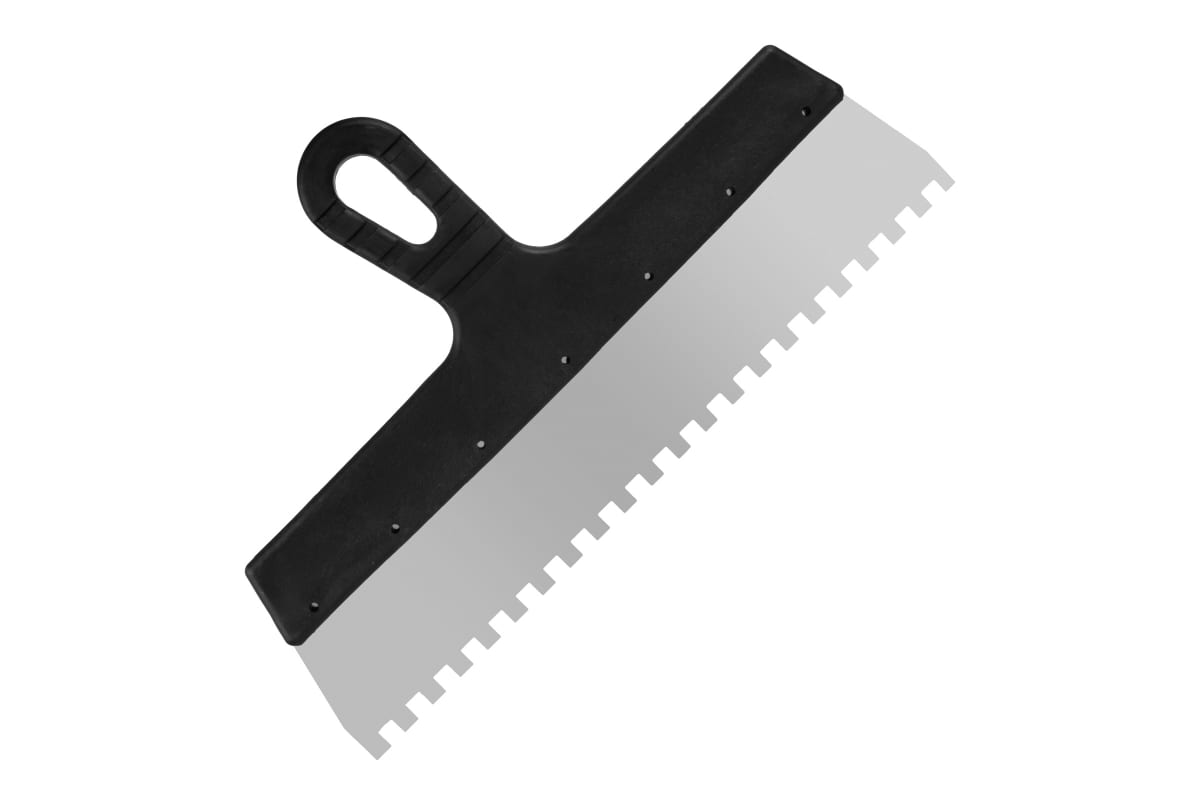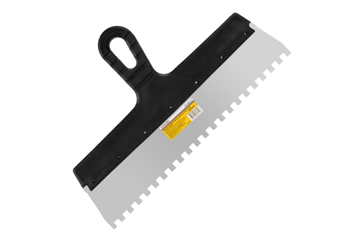 Фасадный зубчатый шпатель (нержавеющая сталь, 350мм, зуб.8x8мм) РемоКолор Мастер 12-8-350 служит для нанесения цементного состава во время укладки кафельной плитки.