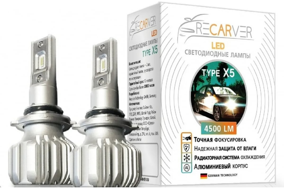 Комплект ламп Recarver LED Type X5 H8/H9/H11, 4500 Лм, 2 шт., 6000 K RTX5LED70H11-2 разработан под строгим контролем по немецкой технологии. Светодиодный чип Sanan (Тайвань) – один из лидеров в производстве светодиодов. Виброустойчивость. Точная фокусировка.