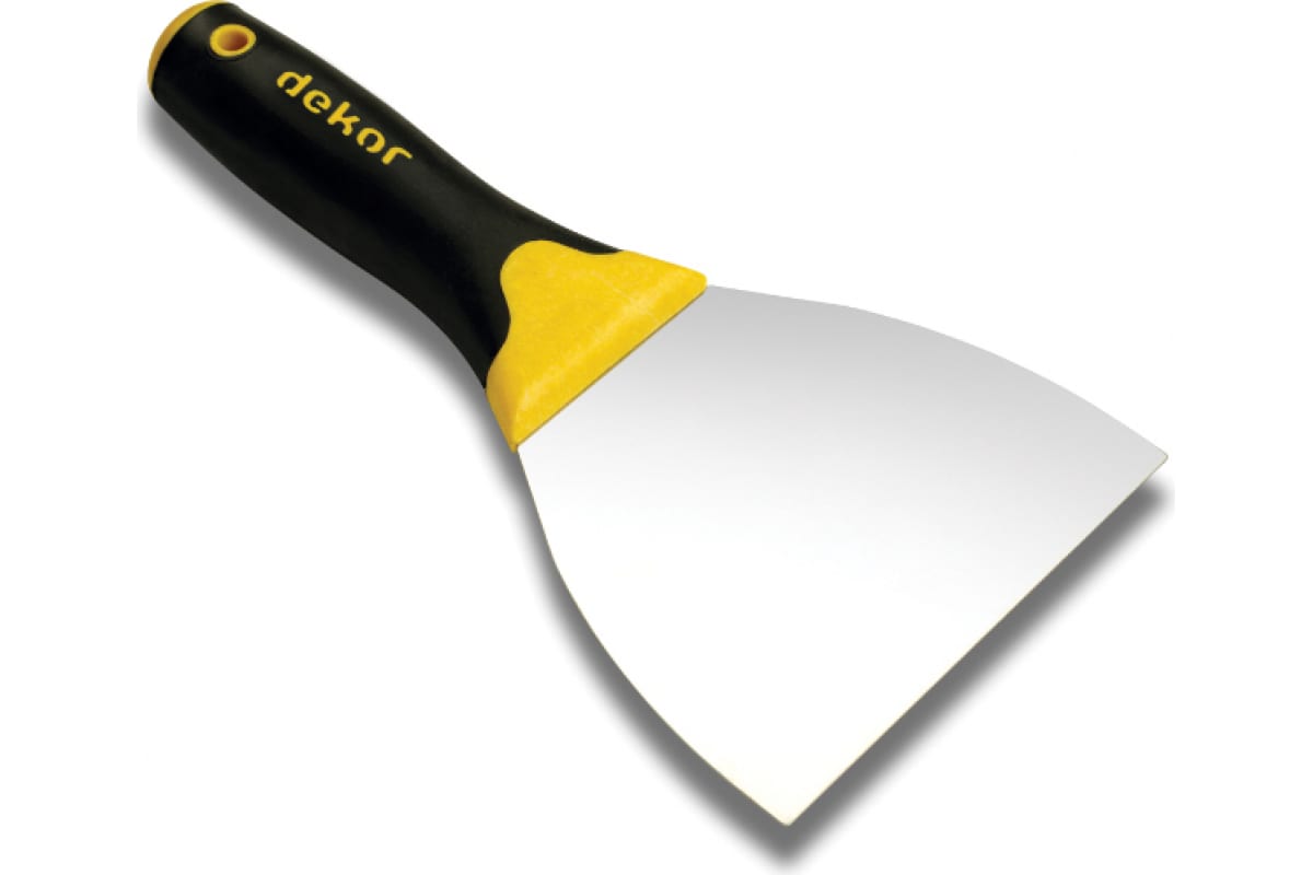Шпатель для шпатлевки DEKOR HASSAN 12см пластиковая ручка нержавеющая 036 состоит из прочной стальной пластины первого класса и рукоятки из термически обработанной древесины.