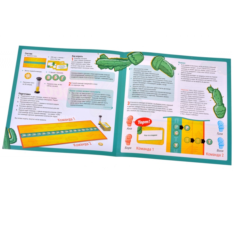 "Перекати-слово" – это словесная вечериночная игра, рассчитанная на две команды игроков. В ней не нужно объяснять слова – их нужно подбирать самостоятельно таким образом, чтобы они включали как можно больше букв, находящихся на поле. Ведь когда вы назовёте слово, его буквы сдвинутся на поле в сторону команды противников – а когда пять букв будут вытеснены за его пределы, вы выиграете! Звучит совершенно несложно, но слово должно соответствовать условию с карточки – например, надо будет назвать какую-то сладость или пятнистое животное. Проверьте свой вокабуляр!