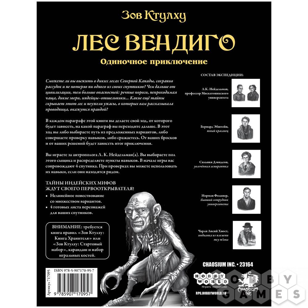 В соло-приключении "Лес вендиго" для настольной ролевой игры "Зов Ктулху" опасность поджидает вас на каждой странице. Новый параграф – новые действия и решения, которые кардинальным образом меняют ваше приключение. Вы берёте на себя роль антрополога Л.К. Нейдельман(а) (пол персонажа вы вольны выбрать самостоятельно), в сопровождении которого имеются 4 спутника. Вначале игры вы самостоятельно распределяете пункты навыков, которые, по-вашему мнению, вам пригодятся больше всего. А во время проверок вы можете использовать не только свои, но и навыки ваших спутников, только если они будут рядом с вами. Нелинейное повествование может завести вас куда угодно, результат будет непредсказуем.