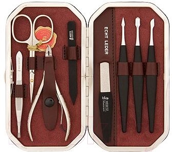 - Инструменты в наборе пинцет, шабер, пушер, ножницы для ногтей, пилка для ногтей, кусачки для кутикулы